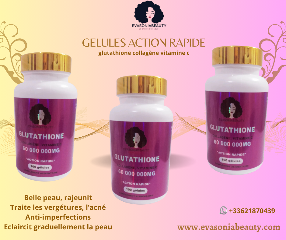 Gelules 100% naturelles contiennent du Glutathione, Vitamines C&E, Collagène, Biotine, Coenzyme Q10 et de L'acide hyaluronique